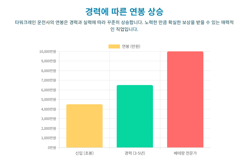 타워크레인 연봉은 중장년층이 이 분야에 도전하는 가장 강력한 동기입니다. 숙련된 타워크레인 기사는 건설 현장의 핵심 인력으로서 압도적인 보상을 받습니다.