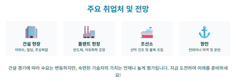 - 주요 취업처: 아파트, 오피스 빌딩 등의 건설 현장이 가장 일반적입니다. 이외에도 대규모 산업 설비 건설이 이루어지는 플랜트 현장이나 조선소 등 특수 환경에서는 높은 숙련도를 요구하며, 그에 따른 추가 수당이 지급되는 경우가 많습니다.