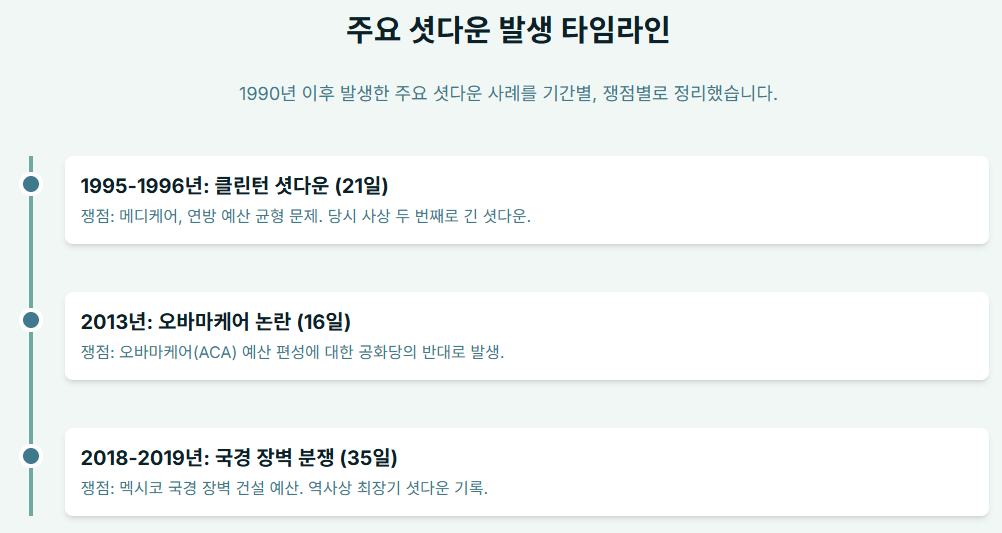 다음은 1990년 이후 발생한 주요 셧다운 이벤트의 개요와 그 배경입니다.