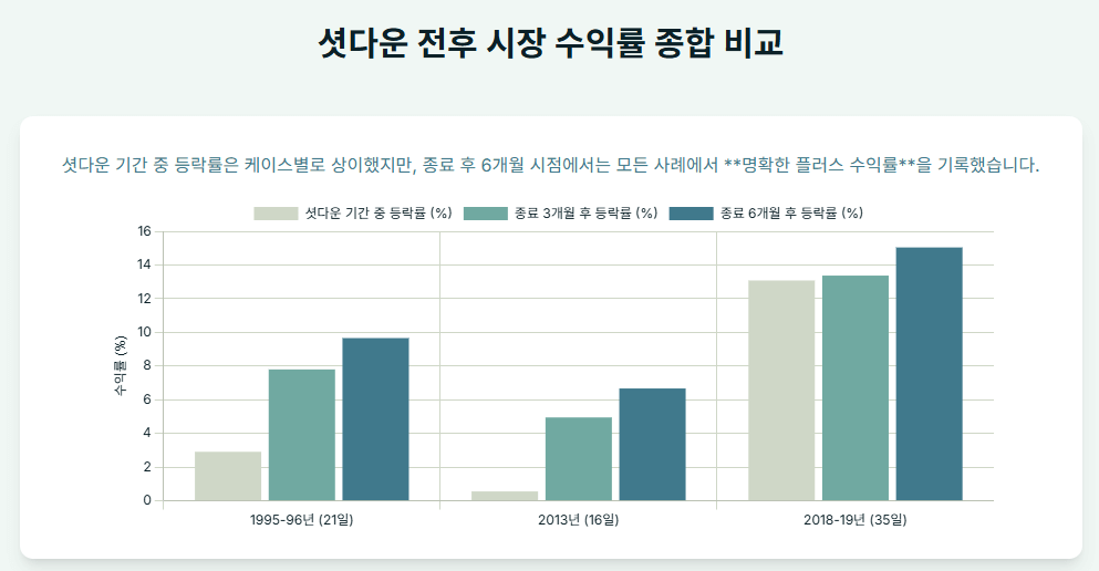 패턴 관찰: 초단기 셧다운은 시장에 실질적인 영향을 미치지 못했습니다. 그러나 종료 6개월 후 수익률이 0%를 기록한 것은 셧다운 자체보다 이후 발생한 거시경제 이벤트(미국 연준의 급격한 금리 인상 가속화, 무역 전쟁 발발)가 시장 성과에 훨씬 더 결정적인 역할을 했음을 보여줍니다. 셧다운은 시장의 단기적인 '노이즈'로 작용했으나, 장기 추세는 펀더멘털에 좌우되었습니다.
