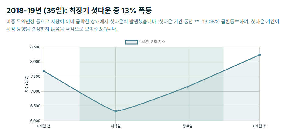 - 맥락: 이 셧다운은 시장이 이미 극심한 약세장(미중 무역 전쟁, Fed의 급격한 금리 인상 공포)을 겪으며 나스닥이 연초 대비 8%가량 하락했던 시점 에 발생했습니다.
