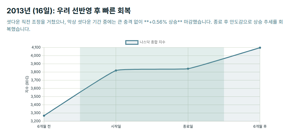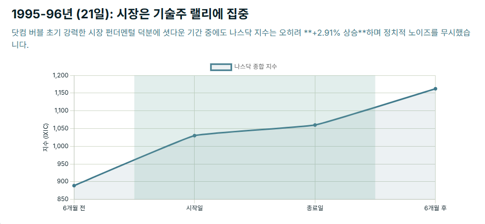 패턴 관찰: 단기적인 충격은 발생했으나, 이는 셧다운 위협이 최고조에 달했을 때 시장이 선반영한 결과였습니다. 당시 나스닥은 닷컴 붐 초입의 강력한 기술주 강세장이 진행 중이었기 때문에 , 이 단기 조정은 장기적인 추세를 뒤집지 못했습니다.