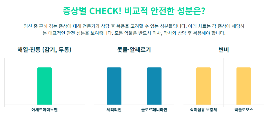 임신 중 흔하게 발생하는 고열, 통증, 감기, 변비 증상에는 식약처가 권고하는 안전 성분을 활용할 수 있습니다.