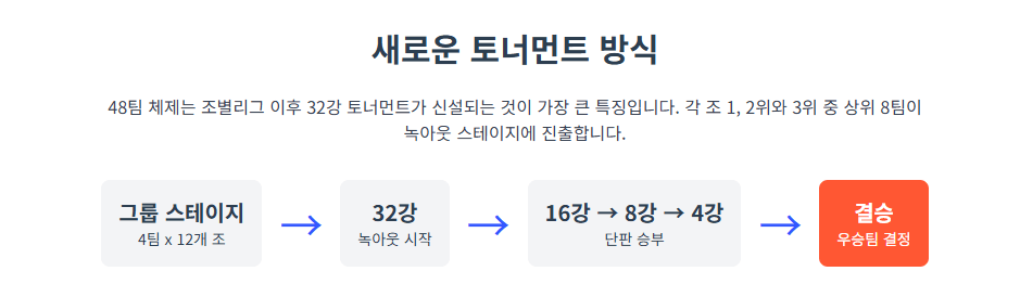 - 총 경기 수: 48개국 참가, 32강 신설로 총 104경기 진행.