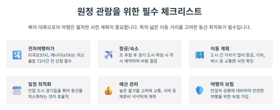 - 장거리 이동이 많을 경우 시차 적응과 체력 안배를 위한 충분한 일정을 포함하여 동선을 계획합니다.
